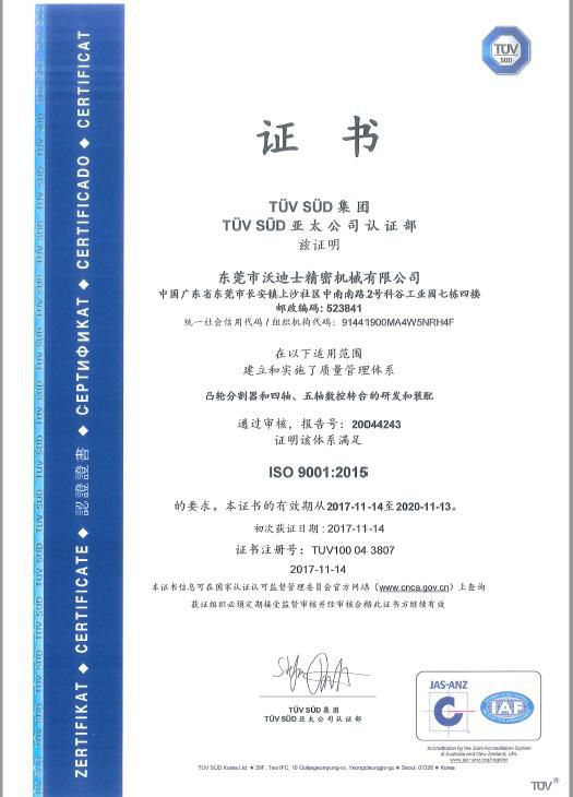 近日沃迪士在"凸輪分割器和四軸、五軸的研發(fā)和裝配”的質(zhì)量管理上的有效性通過了國際權(quán)威認(rèn)證機(jī)構(gòu)南德TUV SUD第二階段的嚴(yán)格審廠,獲得了ISO9001:2015 證書。
